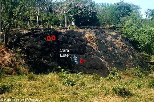 En la cara Este hay dos dibujos (00 y 01). Ambos dibujos están apuntando directamente hacia el Oeste. La fotografía, tomada en 2000, muestra el dibujo 01 pintado con tiza para mejor contraste en la fotografía. El dibujo 00 fue descubierto en la tercera visita, en 2002, y por lo tanto no fue pintado con tiza en 2000 ni aparece en esta fotografía.