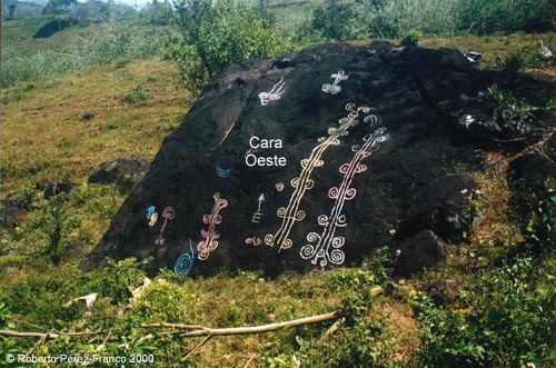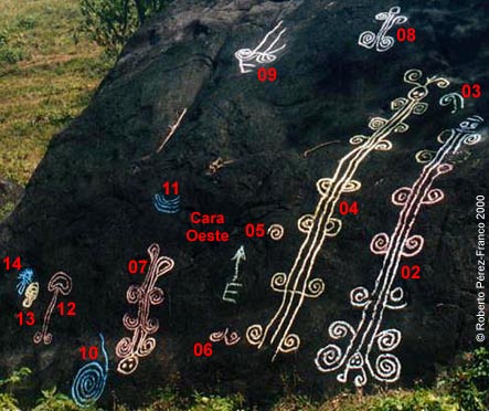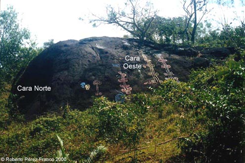 Como se ve en la fotografía sobre estas líneas, hay muchos dibujos en la cara Oeste y ninguno en la cara Norte. Estos dibujos fueron marcados con tiza para mejor contraste en la fotografía.
