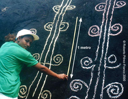 Para tener una escala del tamaño de los dibujos, Cristina Torres, mi amiga de Capira, sostiene para la cámara una cinta métrica extendida justo en la medida de un metro, junto a los dibujos 02 y 04.