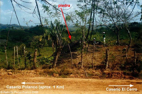 La piedra (08°46.856N 079°49.453W 129m) con los dibujos está a poco más de 1 Km al Sureste del caserío llamado Polanco, a la orilla Noreste del camino de tierra que corre de Noroeste a Sureste, uniendo a éste con el poblado de El Cerro.