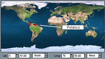 Mapa #3. Mapa de Polanco en la República de Panamá. Se muestran también otros sitios de petrograbados. Generado con Microsoft World Atlas.